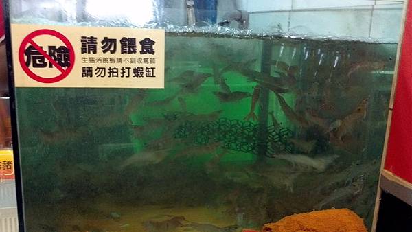 店內有一水缸,放活蝦,服務人員會將蝦放至食材區