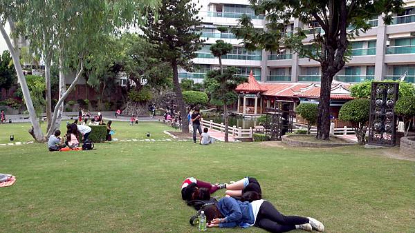 有大草坪,很多人在草坪上,也有人在睡午覺