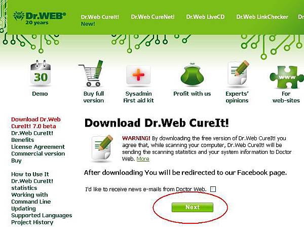(2) 點選上方選項"Download Dr.Web CureIt! and send the statistics"
