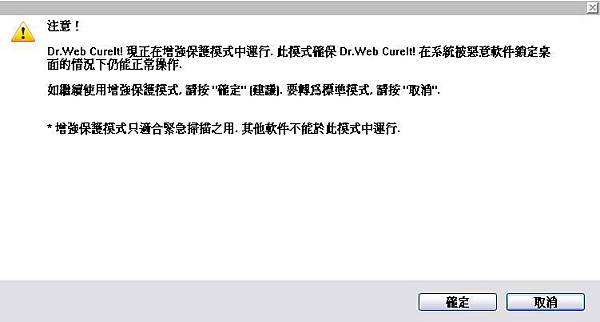 (4) 下載的執行檔直接點選,不需安裝,即可進行掃毒程序;執行後,選擇"確定",進入增強保護模式